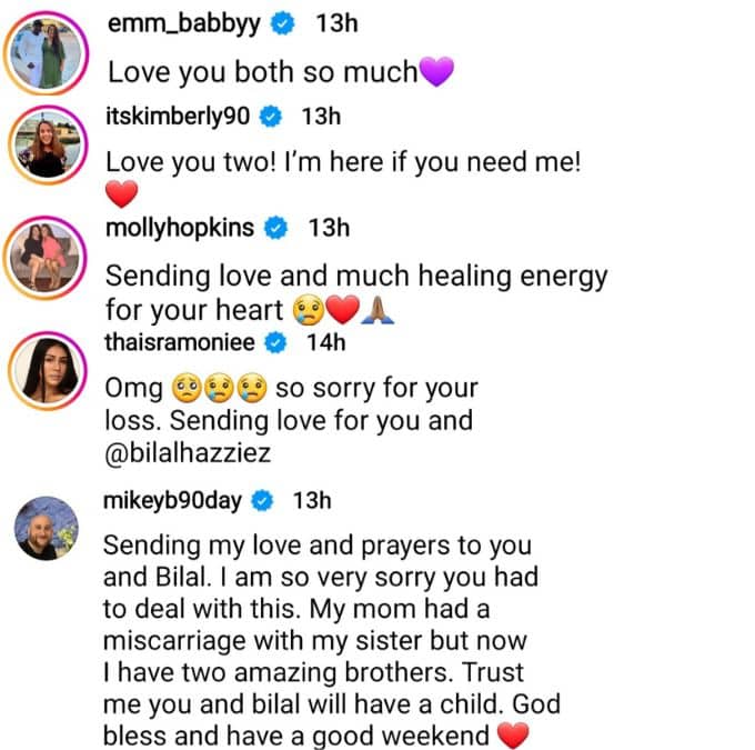 Many of the well wishes came from Shaeeda and Bilal’s fellow 90 Day Fiance castmates. Emily Bieberly and Kimberly Menzies each expressed their love for the couple, while Molly Hopkins did the same, sending “love and much healing energy” their way.